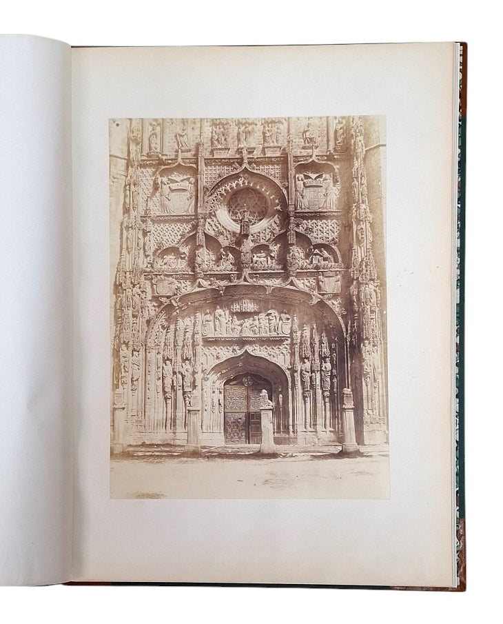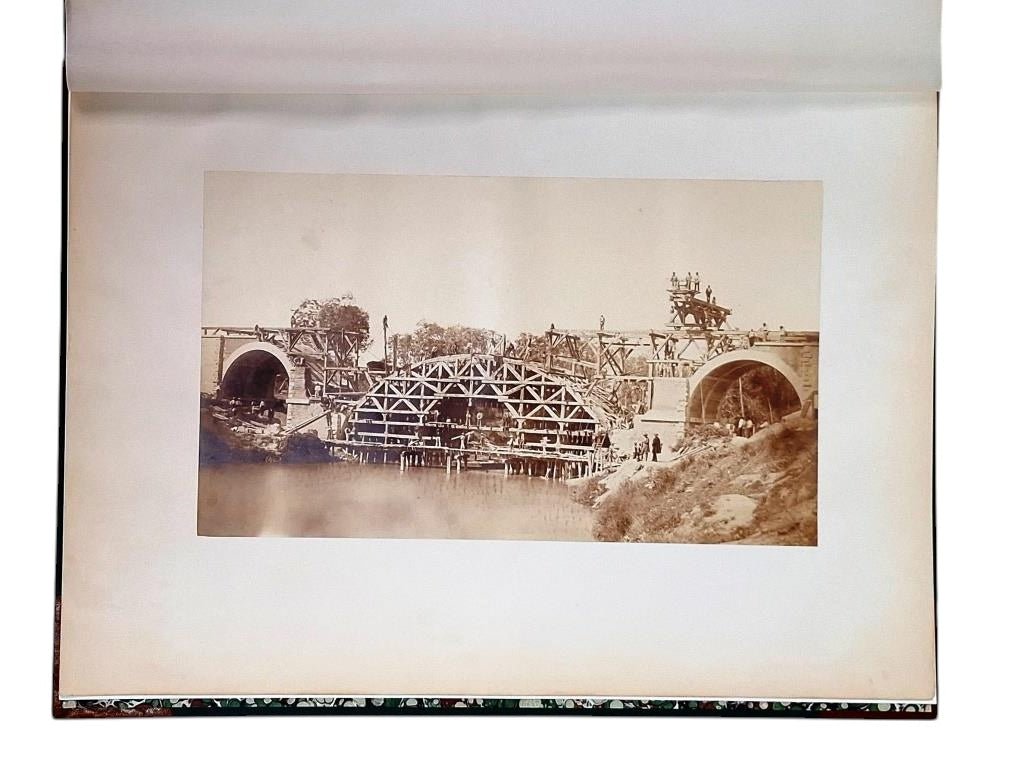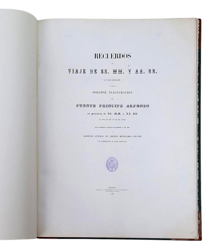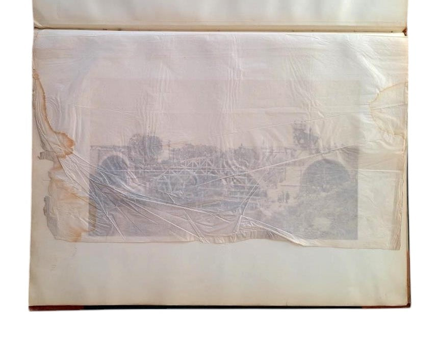 The album , "Memories of Their Majesties' and Their Royal Highnesses' Journey to Valladolid and the Solemn Inauguration of the Prince Alfonso Bridge ," consists of five pages of text and ten albumen prints mounted on paper. Although Clifford began his career as a photographer using the daguerreotype and later the calotype, by 1856 he was already using wet collodion negatives and albumen prints, a variant of the salt print invented by Talbot. In this process, the paper is treated with egg white, salts, and silver nitrate, giving the image a characteristic satin-like appearance with sepia tones shifting to purple. The print was obtained on a contact print press by direct exposure to sunlight, requiring no development but simply fixing. Albumen prints are always mounted on a secondary support, as the paper is thin and curls due to the shrinkage of the albumen.