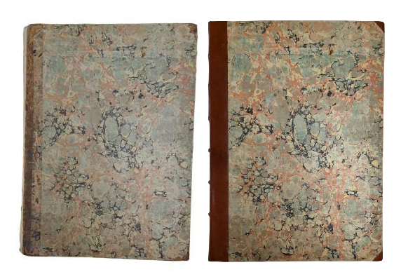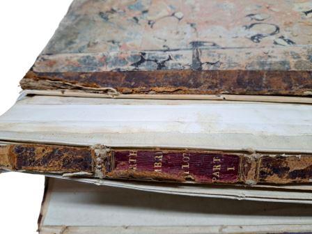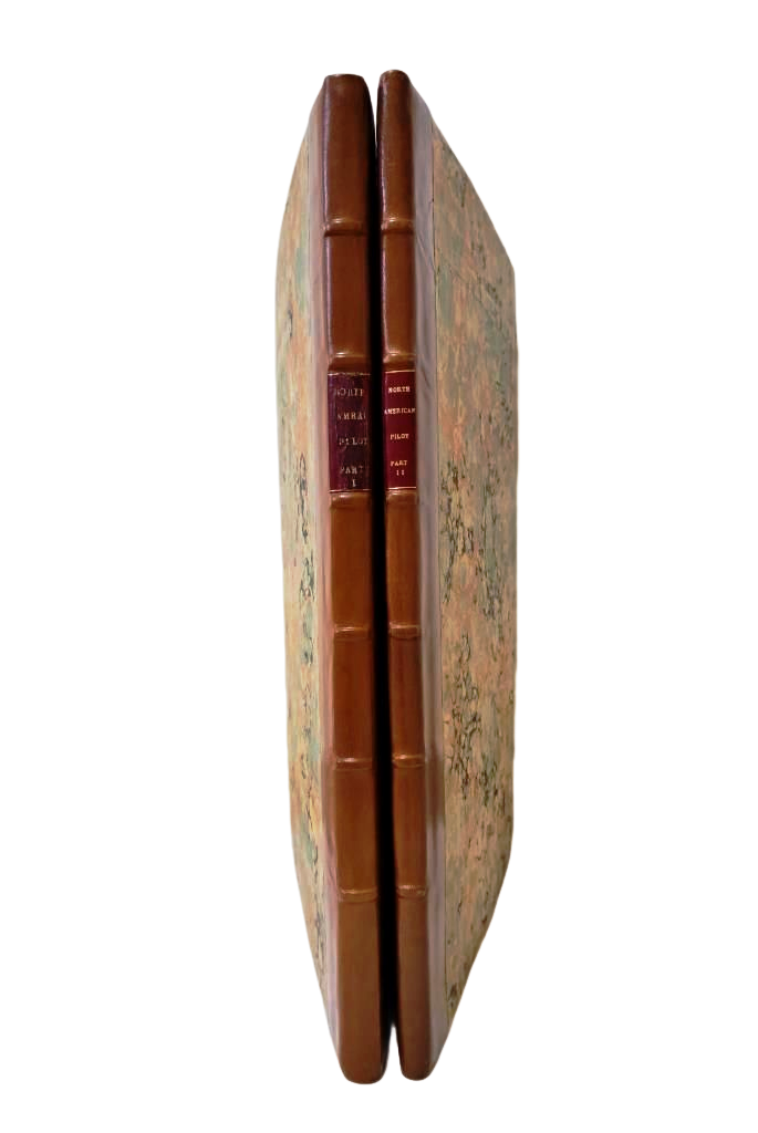 When The North American Pilot came into our possession, the most serious alteration in both volumes was a severe deterioration of the binding that jeopardized the integrity of the work. Inside, the thread and cords of the sewing were broken, and the cardboard boards showed tears and paper loss. Externally, the broken cords had caused the cardboard boards to detach from the spine. The leather covering the spine and corners was badly eroded or missing entirely, and was beyond repair. The title label of Volume II had completely disappeared, as had the four headbands, while the title label of Volume I was partially preserved.