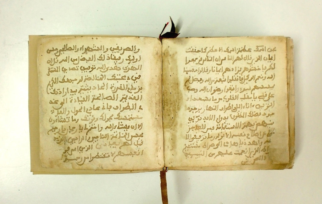 The first step, therefore, was to create a diagram of the book's composition and take photographic documentation. The restoration process began with a dry cleaning of each leaf. The last quires, which appeared to have been added to the book block later due to the stitching, had several millimeters of mud along their inner margins; generally, there was an accumulation of dust and dirt in the center of all the quires. After this cleaning, we used a plant-based adhesive to repair tears, graft lost paper, and reassemble divided bifolios. We sewed the book block, reproducing the original stitching—single-thread stitching without a loom or cords, as is typical in Arabic bookbinding. We also reproduced the headbands using the same method: flat headbands with a herringbone pattern embroidered on a leather core, which in turn secure the piece of cloth that joins the book block to the covers. The restoration of the covers consisted of rehydrating and consolidating the leather and grafting the losses with leather of similar quality and tone. Finally, once the book block was reintegrated into the protection of its binding, we made a custom conservation box for the manuscript.