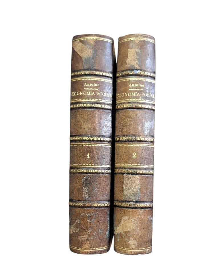 Modern Spain, Madrid, no date of publication. Volume I - 496 pages. Volume II - 464 pages. Contemporary half-leather binding; worn. Previous owner's bookplate. Removed from library records. - Part One: The Social Order. Political Society. The State. Justice and Charity. The Church. The Social Question. The Liberal School. The Socialist School. The Catholic School. Part Two: The Economic Order. Production of Wealth. Analysis of Production. Labor. Capital. Association. Economic Freedom. Property. Main Forms of Distribution. On Wages. On Just Wages. Poverty and Charity.