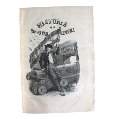 HISTORY OF THE SPANISH ROYAL NAVY FROM THE DISCOVERY OF THE AMERICAS TO THE BATTLE OF TRAFALGAR. Printed by José María Ducazcal, Madrid, 1854. Volume I of 1856 (second edition) and Volume II of 1854 (first edition). Volume I: Title page + 669 pages + numerous illustrations in the text and 8 plates outside the text, including a portrait of Columbus, another of Magellan, and 6 lithographs by Urrabieta. Volume II: Half-title page + full-page lithograph by Urrabieta from the workshops of J.J. Martínez + Title page + 835 pages + numerous illustrations in the text and 11 plates outside the text, including lithographs of scenes and portraits. The paper in Volume I is in uneven condition: some pages are browned and mottled with foxing. Volume II has more uniform paper but also some foxing. Beautiful parchment Dutch binding with label and cloth boards. 30.5 x 22 cm.