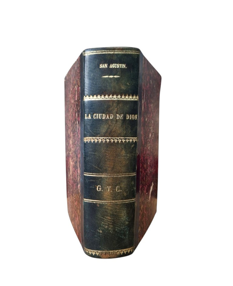 Two volumes in one. Printed by José María Aylodi, Valencia, 1871. Contains the beginnings and progress of this city, with a defense of the Christian religion against the errors and calumnies of the pagans. Translated from Latin into the vernacular by Antonio de Roys y Rozas. Volume I - 424 pages + 10 leaves. Volume II - 374 pages. Contemporary half-leather binding; covers slightly rubbed. Previous owner's initials stamped on the spine.