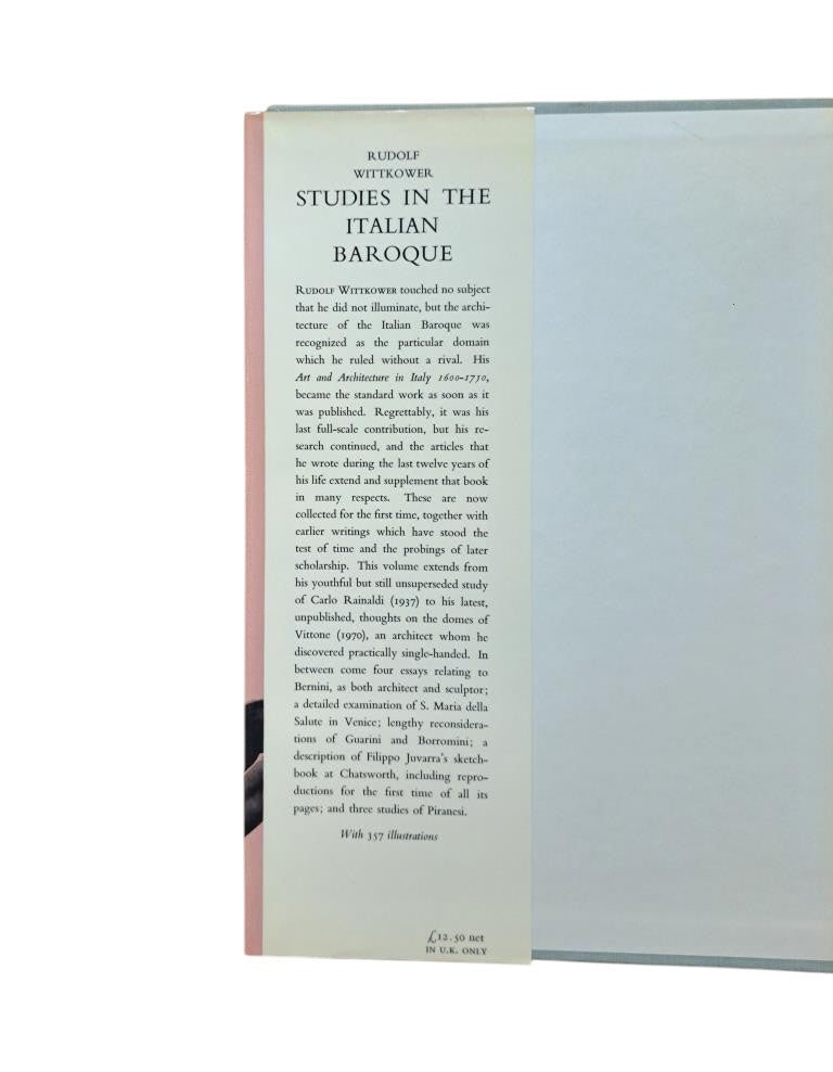 With 357 illustrations. Thames and Hudson, London, 1975. Publishing cloth with dust jacket. 304 pages.- Carlo Rainaldi and the Architecture of the High Baroque in Rome. The Third Arm of Bernini's Piazza S. Pietro. A Counter-Project to Bernini's Piazza S. Pietro. The Vicissitudes of a Dynastic Monument: Bernini's Equestrian Statue of Louis XIV. The Role of Classical Models in Bernini's and Poussin's Preparatory Work. Pietro da Cortona's Project for Reconstructing the Temple of Palestrina. Santa Maria della Salute. Francesco Borromini, his Character and Life. Guarini the Man. A sketchbook of Filippo Juvarra at Chatsworth. Vittone's Domes. Vittone's Drawings in the Musée des Arts Décoratifs. Piranesi's Architectural Creed. Piranesi as Architect. Piranesi and Eighteenth-century Egyptomania.