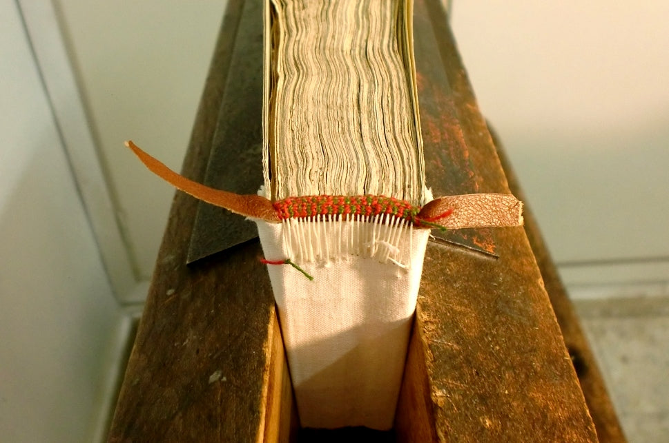 La première étape a donc consisté à établir un schéma de la composition du livre et à en réaliser une documentation photographique. La restauration a débuté par un nettoyage à sec de chaque feuillet. Les derniers cahiers, apparemment ajoutés ultérieurement au corps d'ouvrage d'après la reliure, présentaient plusieurs millimètres de boue sur leurs marges intérieures ; de manière générale, on constatait une accumulation de poussière et de saleté au centre de tous les cahiers. Après ce nettoyage, nous avons utilisé une colle végétale pour réparer les déchirures, greffer les feuilles manquantes et réassembler les bifolios divisés. Nous avons cousu le corps d'ouvrage en reproduisant la reliure d'origine : une couture à un fil, sans métier à tisser ni cordons, comme il est d'usage dans la reliure arabe. Nous avons également reproduit les tranchefiles selon la même méthode : des tranchefiles plates brodées d'un motif à chevrons sur une âme en cuir, qui maintiennent la pièce de tissu reliant le corps d'ouvrage aux plats. La restauration des plats a consisté à réhydrater et à consolider le cuir, puis à greffer les parties manquantes avec un cuir de qualité et de teinte similaires. Enfin, une fois le bloc-livre réintégré dans la protection de sa reliure, nous avons fabriqué un coffret de conservation sur mesure pour le manuscrit.