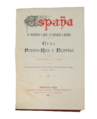 ESPAGNE. SES MONUMENTS ET SES ARTS, SA NATURE ET SON HISTOIRE. Imprimerie Daniel Cortezo, Barcelone, 1887. Page de titre, 944 pages. Photogravures de Joarizti et Mariezcurrena. Dessins de Passos et Riquero. Chromolithographies de Xumetra. Reliure d'éditeur en toile imprimée. Tranches peintes. Une belle édition, réalisée avec soin.