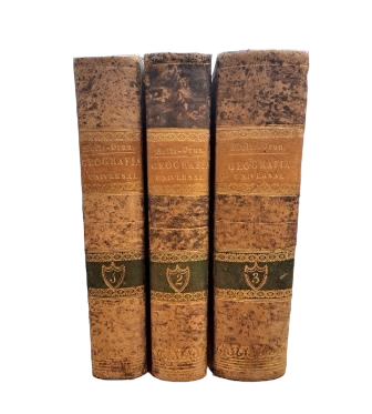 GÉOGRAPHIE UNIVERSELLE OU DESCRIPTION DE TOUTES LES PARTIES DU MONDE selon un plan nouveau, précédée d'une histoire générale de la géographie de tous les peuples anciens et modernes, et d'une théorie générale mathématique, physique et politique. Librería Española, Madrid-Barcelone, 1853. Tome I - 822 p. Tome II - 839 p. Tome III - 1073 p. « Un ouvrage orné de planches exquises représentant des villes, des monuments, des pays, etc., toutes d'après nature » ; cartes et plans. Reliure plein cuir espagnol en excellent état ; tranches peintes. Le cuir est légèrement usé. Cachet de l'ancien propriétaire. Retiré des registres de la bibliothèque. Inscription manuscrite à l'intérieur de la page de garde : « C'est un auteur impie, passionné par les principes de la Révolution française. Attention ! »