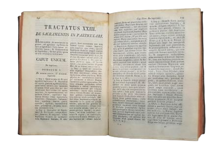 In tres tomos distributum, universae theologiae moralis quaestiones... Barcelone, 1817. Tome I - 589 pages. Tome II - 517 pages. Tome III - 578 pages. Reliure d'époque en plein cuir espagnol ; gardes marbrées ; tranches peintes. Provenant d'un désherbage, cet ouvrage est en bon état général ; quelques taches sur le papier n'altèrent pas le texte ; quelques éraflures sur la reliure en cuir.