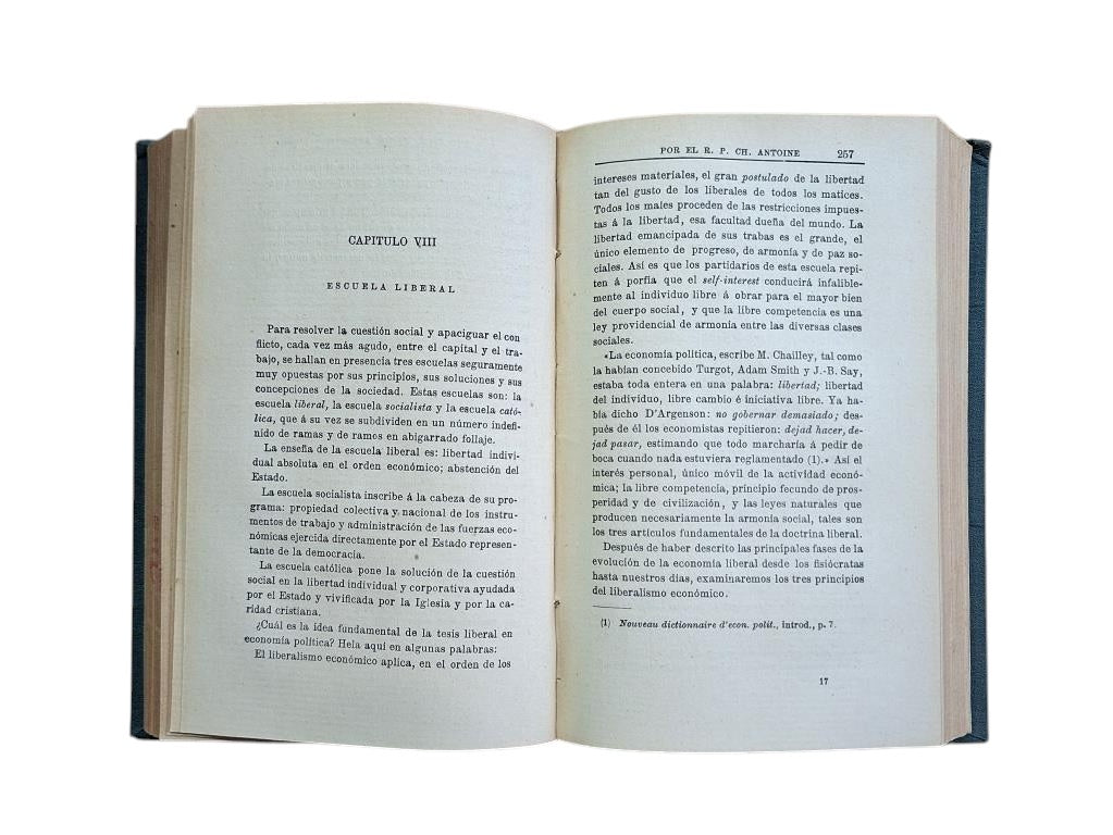 La España Moderna, Madrid, sin fecha de edición. Tomo I.- 496 págs. Tomo II.- 464 págs. Encuadernación de época en media piel; rozada. Exlibris estampillado de anterior propietario. Dado de baja en biblioteca. - Primera Parte: El orden social. Sociedad política. El Estado. Justicia y caridad. La Iglesia. La cuestión social. La escuela liberal. Escuela socialista. La escuela católica. Segunda Parte: El orden económico. Producción de las riquezas. Análisis de la producción. El trabajo. El capital. La asociación. La libertad económica. La propiedad. Principales formas de la distribución. Del salario. Del justo salario. Miseria y beneficencia.