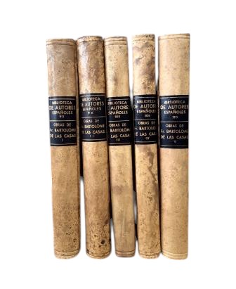 Atlas, Madrid, 1957. Biblioteca de Autores Españoles. Tomo I.- Historia de las Indias. CLXXXVIII + 502 págs. Tomo II.- Historia de las Indias. 617 págs. Tomo III.- Apologética Historia. XXXII + 470 págs. Tomo IV.- Apologética Historia. 472 págs. Tomo V.- Opúsculos, cartas y memoriales. XXIII + 557 págs. Encuadernación en plena piel pasta española.